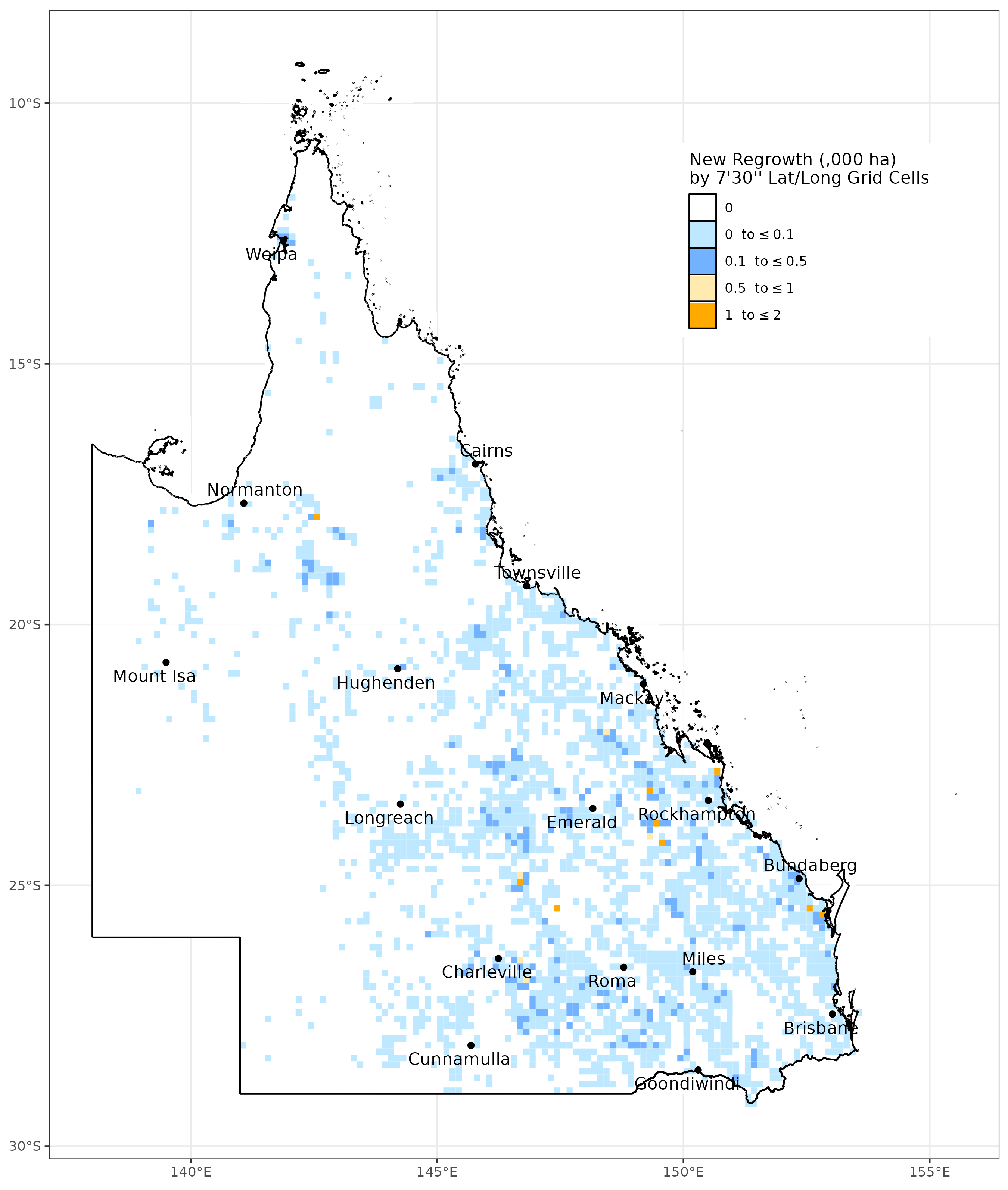 In the 2022–23 monitoring period, 84,649ha of new regrowth was mapped. This is a significant increase in the amount of new regrowth added for the state compared to previous years.