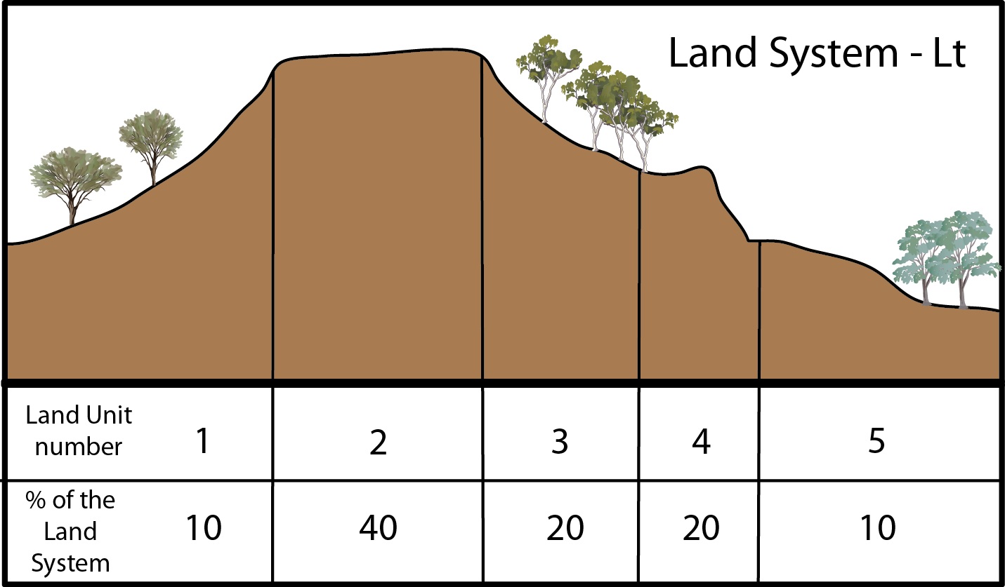 A typical land system is split into several land units. These land units may not be mapped but only described in reports. Land units are distinctive landscape positions (within a land system) with characteristic soil–vegetation associations.