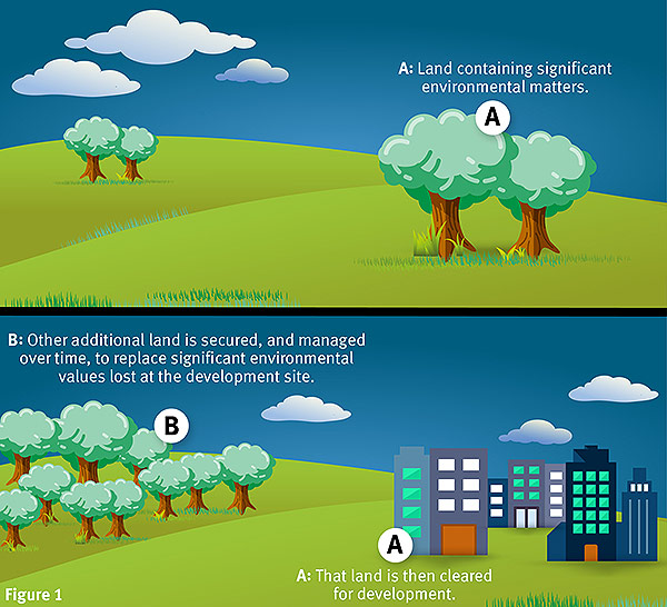 Figure 1 provides a simple illustration of the basic concept of providing an environmental offset. Figure 1 illustrates land containing environmental values at one site being cleared for development. Those environmental values are then replaced by providing an environmental offset at another site, which contains those same environmental values which were impacted as a result of the development.