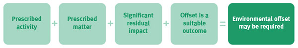 An environmental offset may be required as a condition of approval where—following consideration of avoidance and mitigation measures—a prescribed activity is likely to result in a significant residual impact on a prescribed environmental matter(s). Figure 2 provides an overview of the process used to determine if an environmental offset is required for an activity.