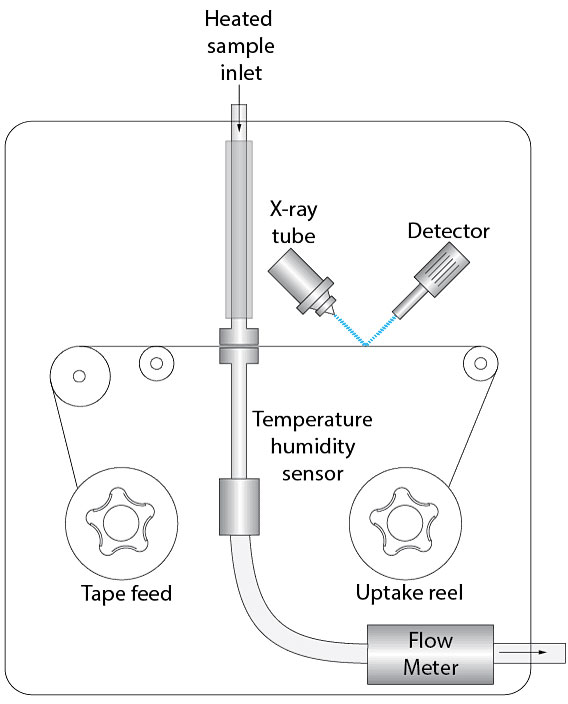 The filter tape and deposited matter moves forward to a position where it is analysed for metal content using X-Ray Fluorescence (XRF) technology.