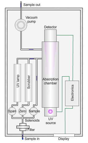 The blue dot in the diagram shows the sample path. The instrument detects a reduction in the intensity of the UV light relative to the concentration of ozone in the sample.