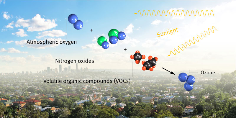 Given sunlight and suitable weather conditions, nitrogen oxides and volatile organic compounds (VOCs) can react to form photochemical oxidants, commonly referred to as photochemical smog, of which ozone is the major component.