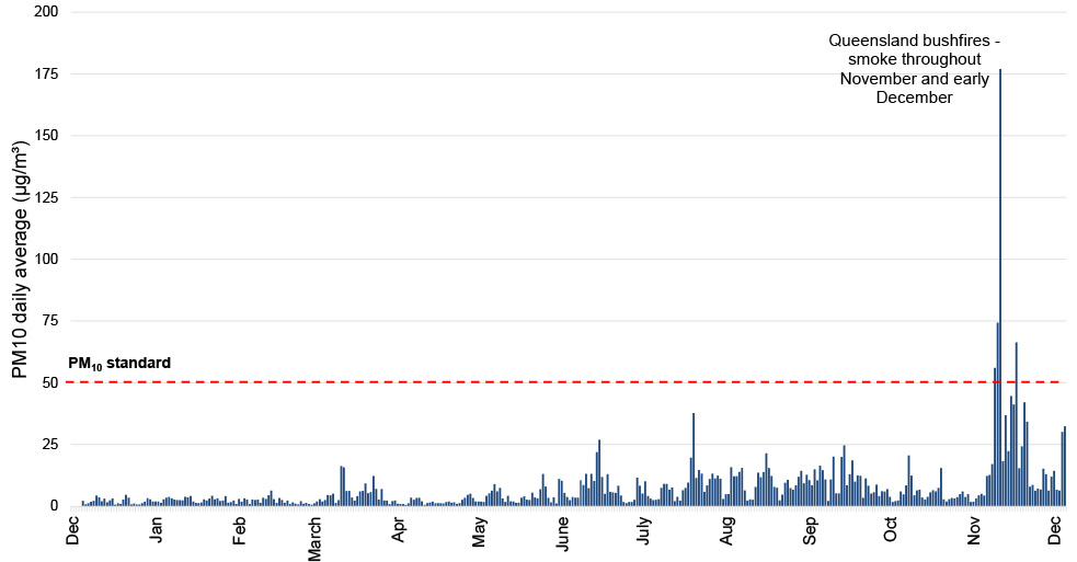 Similarly, PM10 data also indicated that air quality is of good quality in the Wynnum area. PM10 averages were also consistently below standard throughout the year, with significant exceedances during November and December 2019 due to bushfire smoke. An exceedance was also identified in July 2020, also likely due to overestimations due to fog.