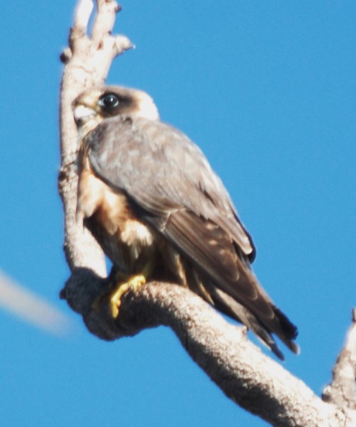 Similar species: Australian hobby Falco longipennis (smaller than the peregrine falcon with a light reddish-brown under surface. The black around its eyes doesn't extend far enough to form a hood).