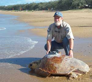 Premiere is the first of a series of loggerhead turtles that were marked as hatchlings using carapace mutilation tagging at Mon Repos during the 1970s and which have returned to the nesting beaches as breeding adults. She was fitted with a radio tag (PPT) and released for tracking studies using satellite telemetry via the ARGOS satellite system during December 2003 and into early 2004.