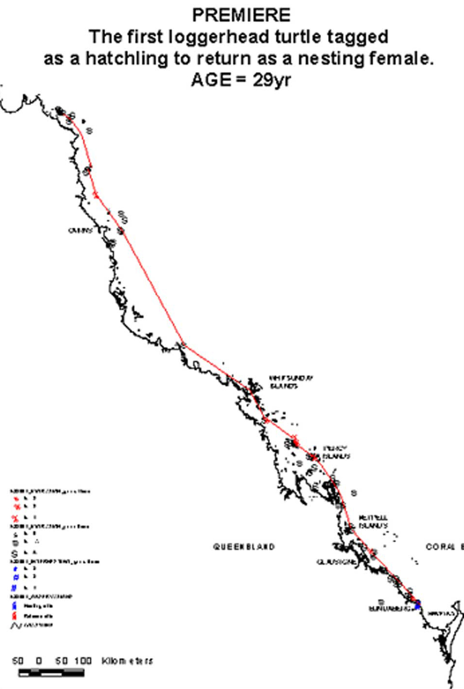 Premiere is an adult female loggerhead turtle originally tagged as a hatchling at Mon Repos Beach in January-February 1975. She is the first of the tagged loggerhead hatchlings recorded returning as a breeding adult. She was recaptured laying eggs on four occasions during November 2003-January 2004. After laying her third clutch for the season she was removed from Mon Repos Beach, fitted with a satellite tracking radio transmitter (PTT) and released from Mon Repos beach on 28 December 2003 (see map).