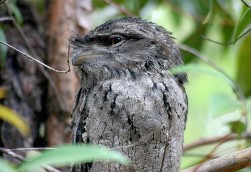 The tawny frogmouth is a true master of disguise. It has streaked and mottled plumage, and when sitting still, it narrows its eye-lids to obscure its yellow eyes. The resulting camouflage is so good that a tawny frogmouth can sit a few metres from someone and still not be spotted, passing easily for a dead tree stump.