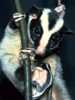 The striped possum is a shy,solitary animal, venturing out at night to munch on flowers, fruits, beetle larvae and pollen. During the day, it rests on a bed of leaves inside a tree hollow or clump of ferns. In places with coconut palms, it's not unusual to hear a commotion as the possum uses its chisel-like teeth to gnaw through leaves and bark in search of insects causing shreds of leaves and trunk to fall to the ground. It will also bite into dead branches or fallen logs to get at borers or grubs. Mating may occur from February to August and up to two young are born.