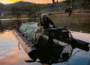 A floating trap consists of an aluminium cage with two floats down its length. A sliding gate is held open with a pin that is connected to a bait at the back of the trap by a line. If the crocodile takes the bait, it pulls the line attached to the pin, which in turn pulls the pin out. This causes the gate to slide shut.