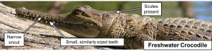 A freshwater crocodile can be distinguished from an estuarine crocodile by its narrow snout and evenly shaped and sized needle-like teeth. There is also a distinguishing row of four large scales on the neck immediately behind the head.