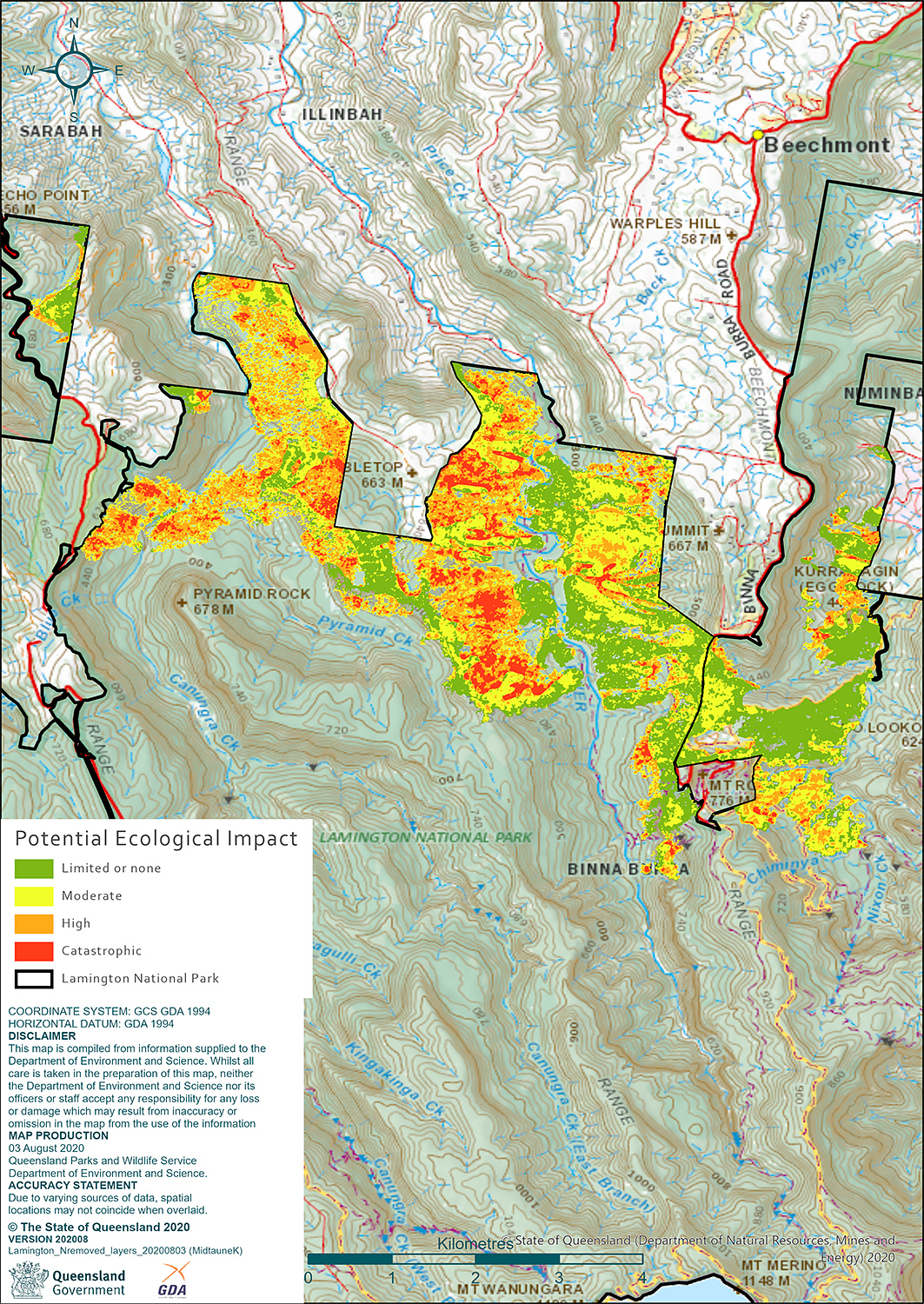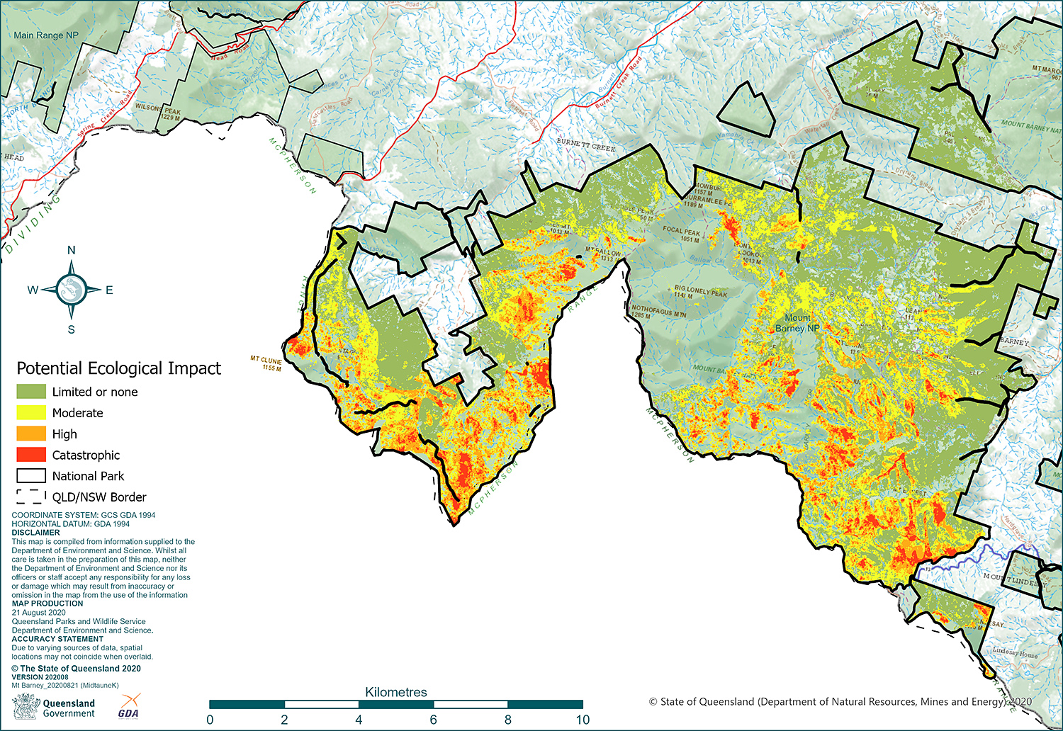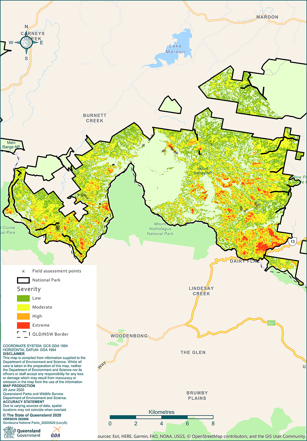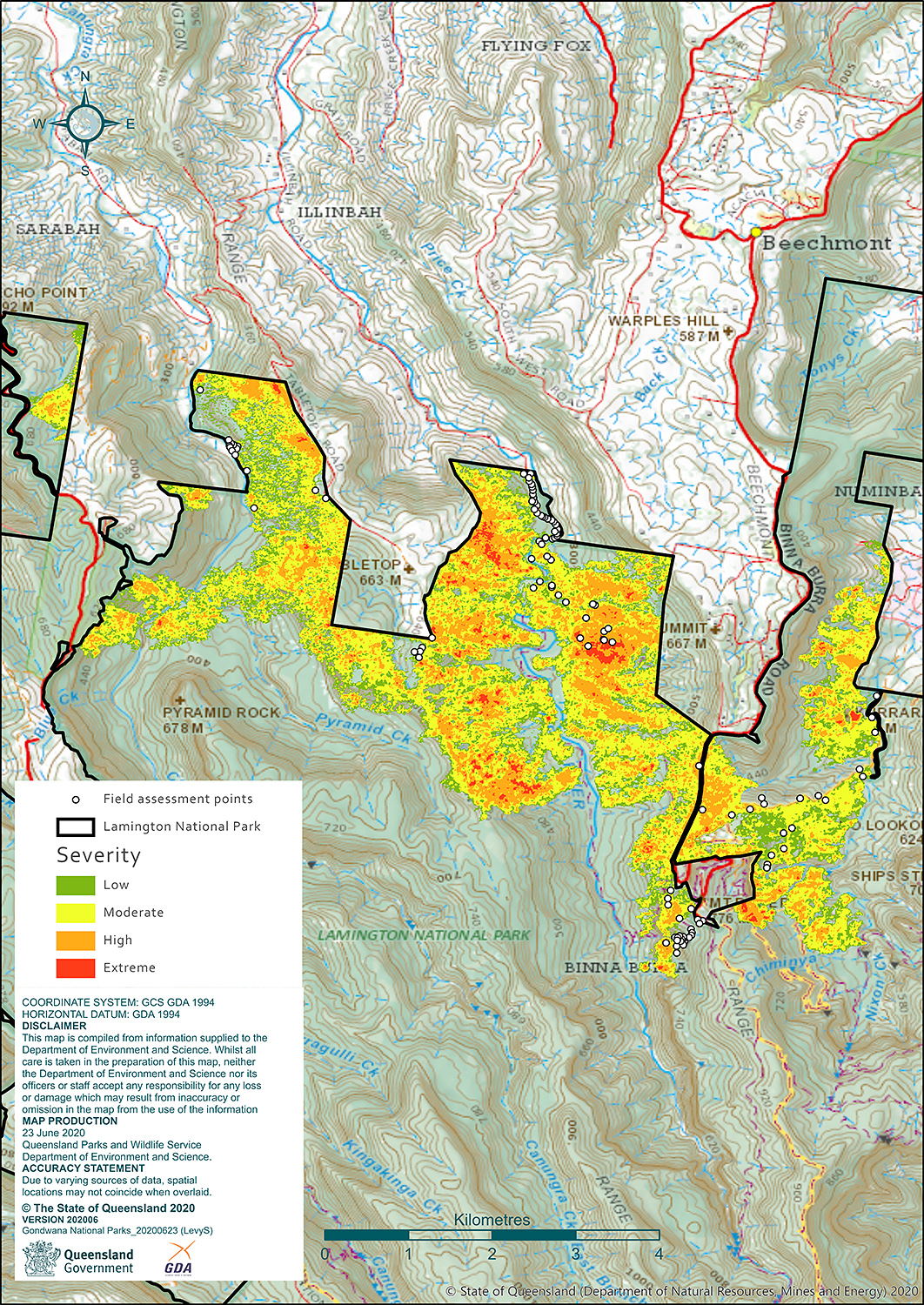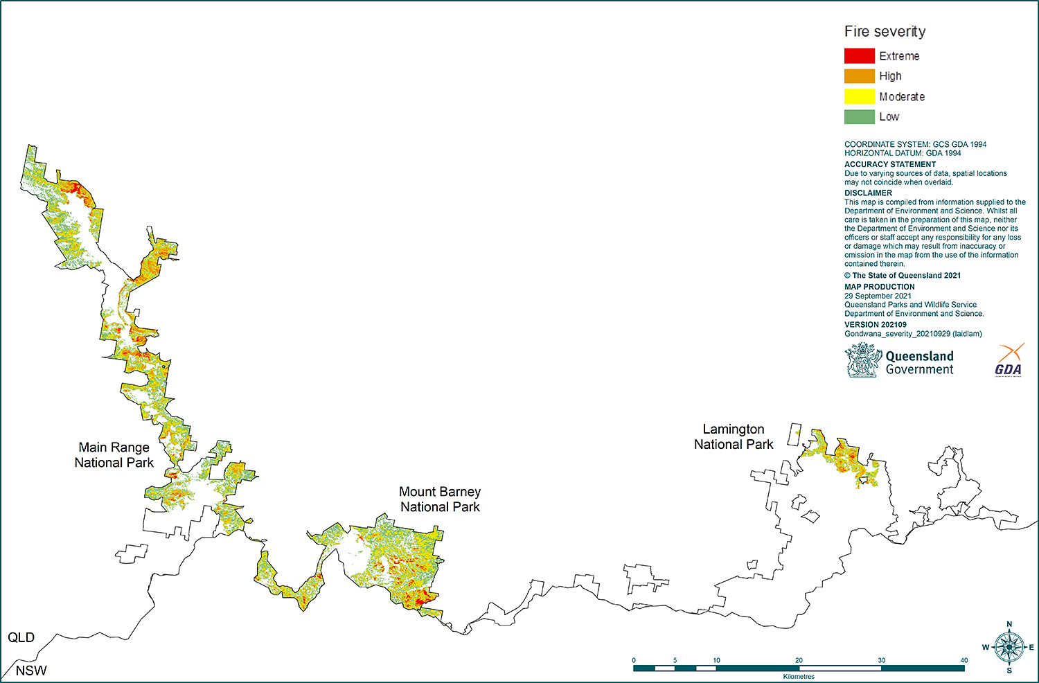 A more detailed assessment of the ecological impacts of the fires was undertaken for each national park in this project. This was initiated with detailed fire severity mapping for the fire-impacted Lamington, Mt Barney and Main Range National Parks.