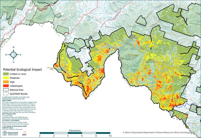 Across Main Range National Park, moderate to high potential ecological impacts were spread across numerous areas.