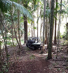 In the northern fire-impacted section of Lamington National Park, a 1 kilometre section of the Old Cedar Road was widened from a track to enable access for side-by-side vehicles to carry water and reduce carriage of a bushfire through the understorey.
