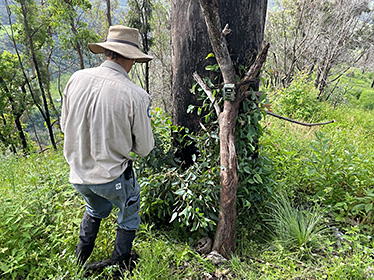 In the Burnett Creek section of Mt Barney National Park, a post-fire increase in pig activity was addressed to protect the recovery of priority threatened frog species in this creek system. New pig traps with remote satellite monitoring devices were deployed, with six pigs trapped and trapping efforts ongoing.