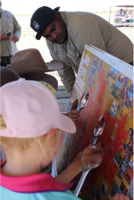 Lake Eyre Basin (LEB) rangers and Indjalandji-Dhidhanu (IDAC) rangers manage the impacts of visitors on Country through engagement and education. They help visitors understand how to avoid spreading invasive species when fishing in the Channel Country, Lake Eyre Basin (Kati Thanda).