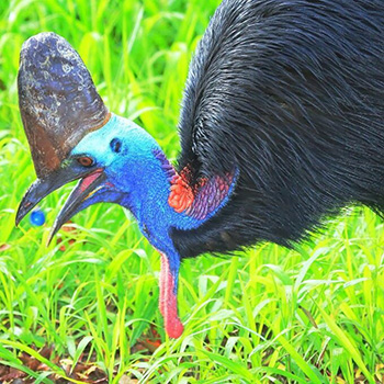 The cassowary's secretive and solitary nature makes them difficult to spot. You may hear their rumbling warning calls and grunts long before you see them.