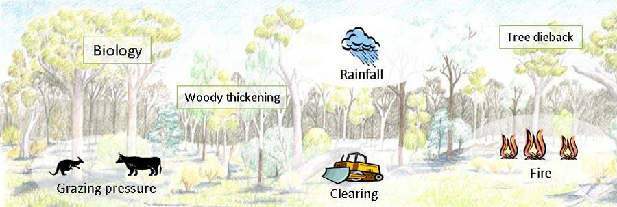 When densities of woody plants increase in a woodland or pasture this is known as ‘woody thickening’. Woody thickening has traditionally been viewed in a negative light by Queensland pastoralists, because of corresponding declines in pasture yield.