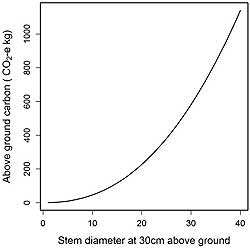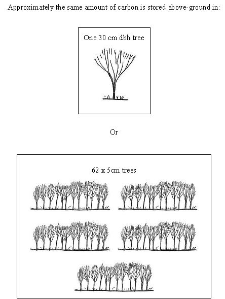 Large trees hold far more carbon than small ones, as the amount of carbon held increases exponentially with the trunk diameter. For example, the carbon held in an average large tree (e.g. approximately 30cm stem diameter) is about the same as that held in 62 smaller trees (e.g. 5cm stem diameters).
