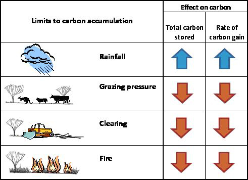 Levels of grazing pressure that remove native grasses, shrubs and small trees, and prevent the recruitment of trees and shrubs will reduce the rate of carbon gain, decrease the capacity of vegetation to store carbon and produce a net carbon loss.