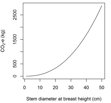 Large trees hold far more carbon than small trees because the amount of carbon held increases exponentially as the trunk diameter of a tree increases. For example, the carbon held above ground in a large tree (e.g. 60cm in diameter) is about the same as that held in 350 smaller trees (e.g. 5cm diameter).