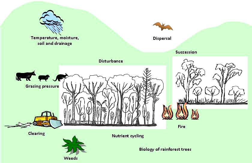 Although rainforest can tolerate some forms of disturbance (e.g. individual tree death or storm damage), other forms of disturbance (such as clearing, grazing, weed invasion and fire) may delay the regeneration of rainforest.
