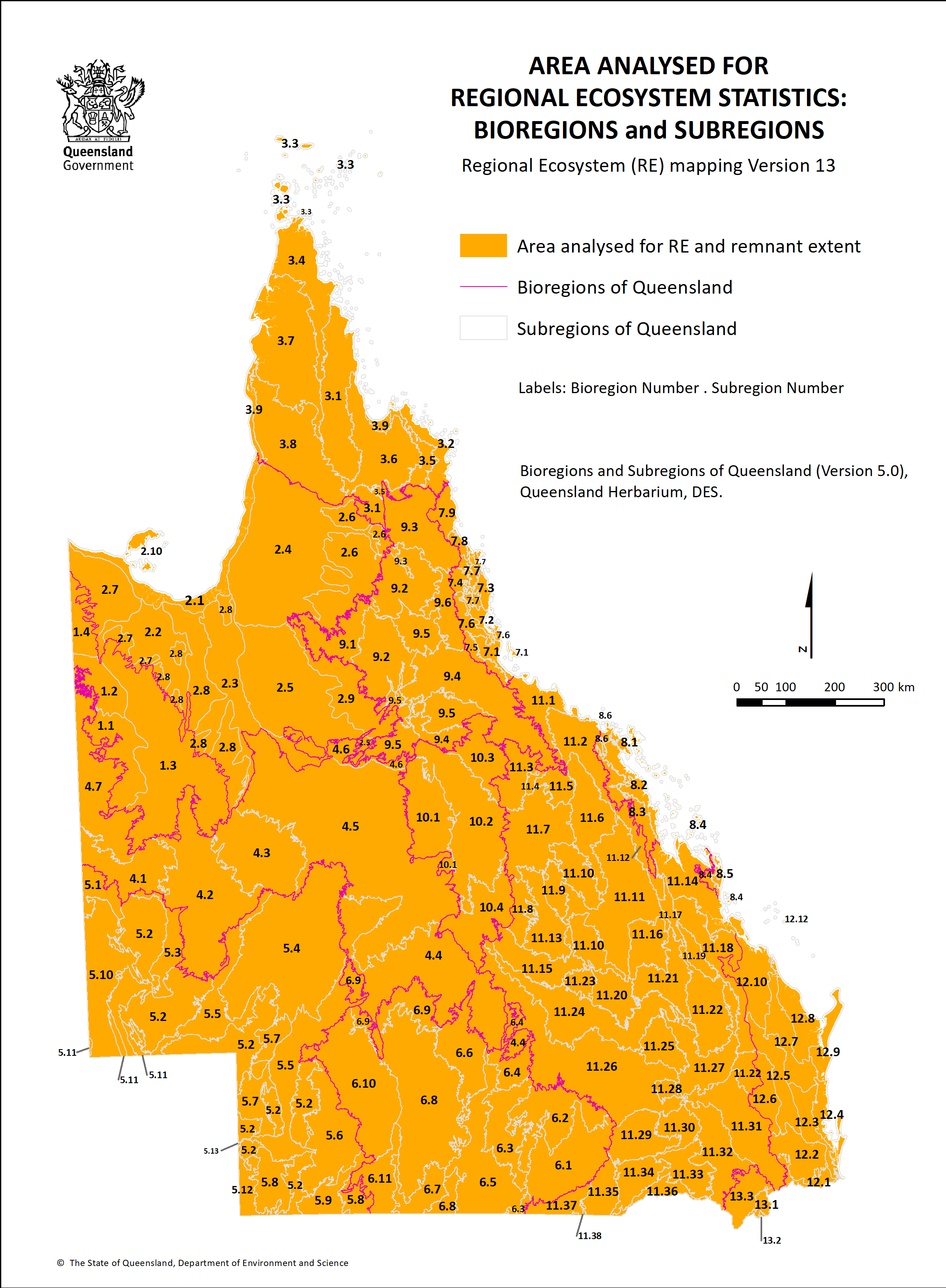 The report is based on the detailed regional ecosystem survey and mapping Version 13.1 Regional Ecosystems (2023) and Version 5.0 Bioregions and subregions of Queensland (Figure 1), which are available on the Queensland Globe and Open Data, QSpatial.
