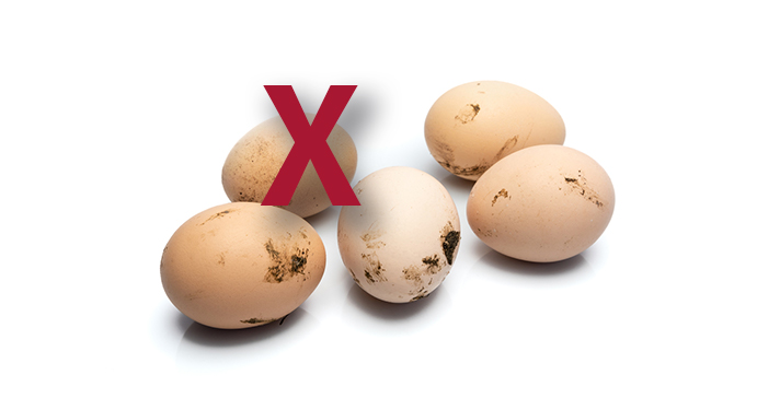 Never wash a dirty egg as this may force bacteria through small cracks into the egg.
