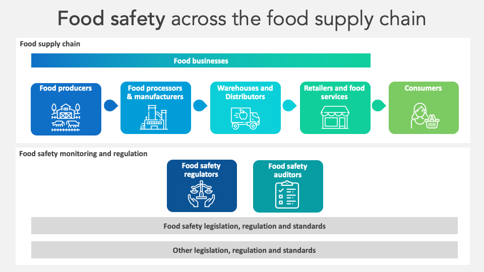 Food safety plays an important part in the food supply chain to ensure that food is safe and suitable for consumers to eat. Food businesses are responsible for complying with food safety legislation, regulation and standards. Food safety regulators and food safety auditors monitor and enforce food laws in Queensland.