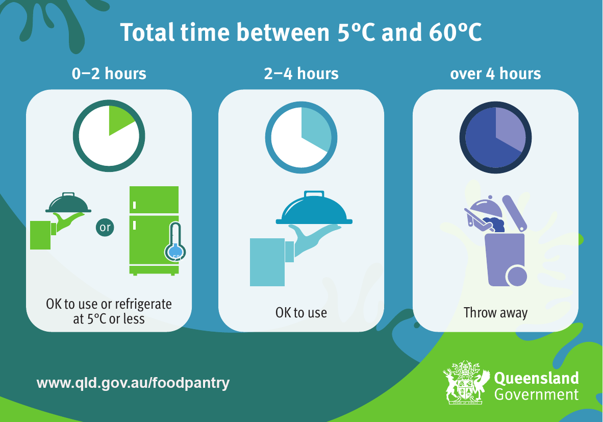If food is going to be cooked in bulk then cooled for future use, ensure that there is adequate refrigerated storage space to ensure foods are cooled from 60°C to 21°C in two hours, then from 21°C to 5°C in a further four hours. It is recommended that foods are placed in small, shallow containers and are not stacked together in the refrigerator, to allow the food to cool as quickly as possible. The local government may ask you to keep records of this process to ensure food is safe.