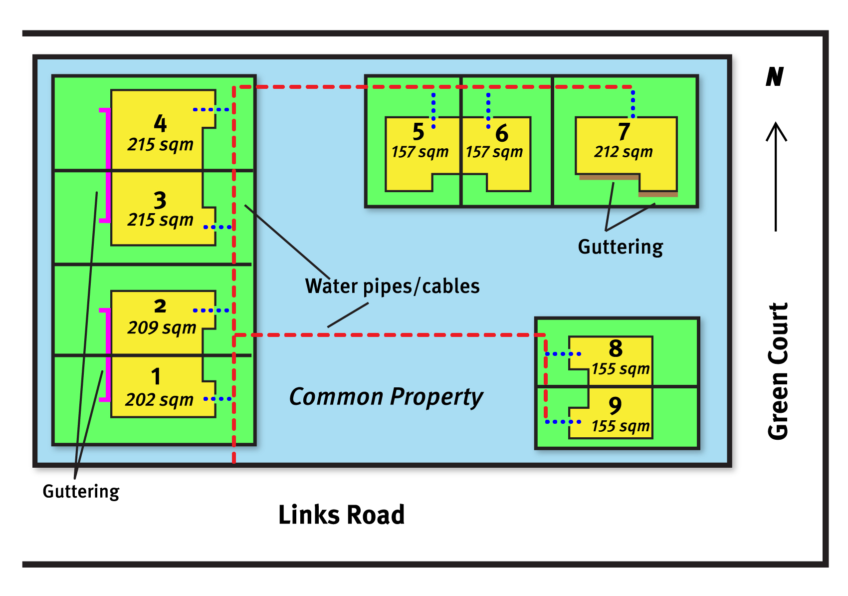 - water pipes or cables shown in red, as these supply the service to more than 1 lot