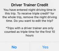 If you take a trip with a driver trainer it can be counted as either triple time or night hours, not both. If you choose the Night time travel option for a trip and you’ve selected a driver trainer as your supervisor, you’ll be shown this message: