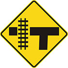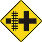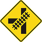 ![]() ![]() ![]() ![]() | Railway crossing on side road or cross road signs A railway level crossing controlled by signs, such as a give way or stop sign, is on the next side road. |