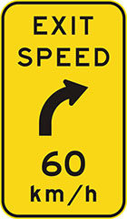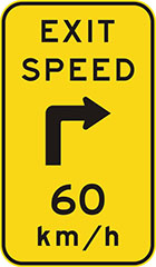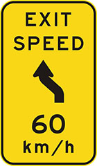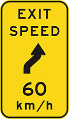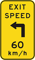 ![]() ![]() ![]() ![]() ![]() ![]() | Exit speed signs When leaving a motorway you should follow the recommended exit speed. The arrow shows you the direction the road takes. These examples show the recommended exit speed for good weather conditions is 60km/h and the direction of the road ahead. |