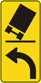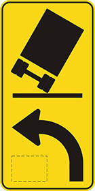 ![]() ![]() ![]() | Tilting truck signs This sign warns that trucks may tip over when driving around the curve of the road or when making a turn. The sign may show the recommended speed limit for heavy vehicles to drive. |